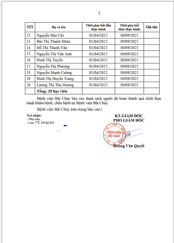 Thông báo 1816 về danh sách người đã hoàn thành quá trình thực hành khám bệnh, chữa bệnh tại Bệnh viện Bãi Cháy tháng 9.2025 2025/10/06 07:15