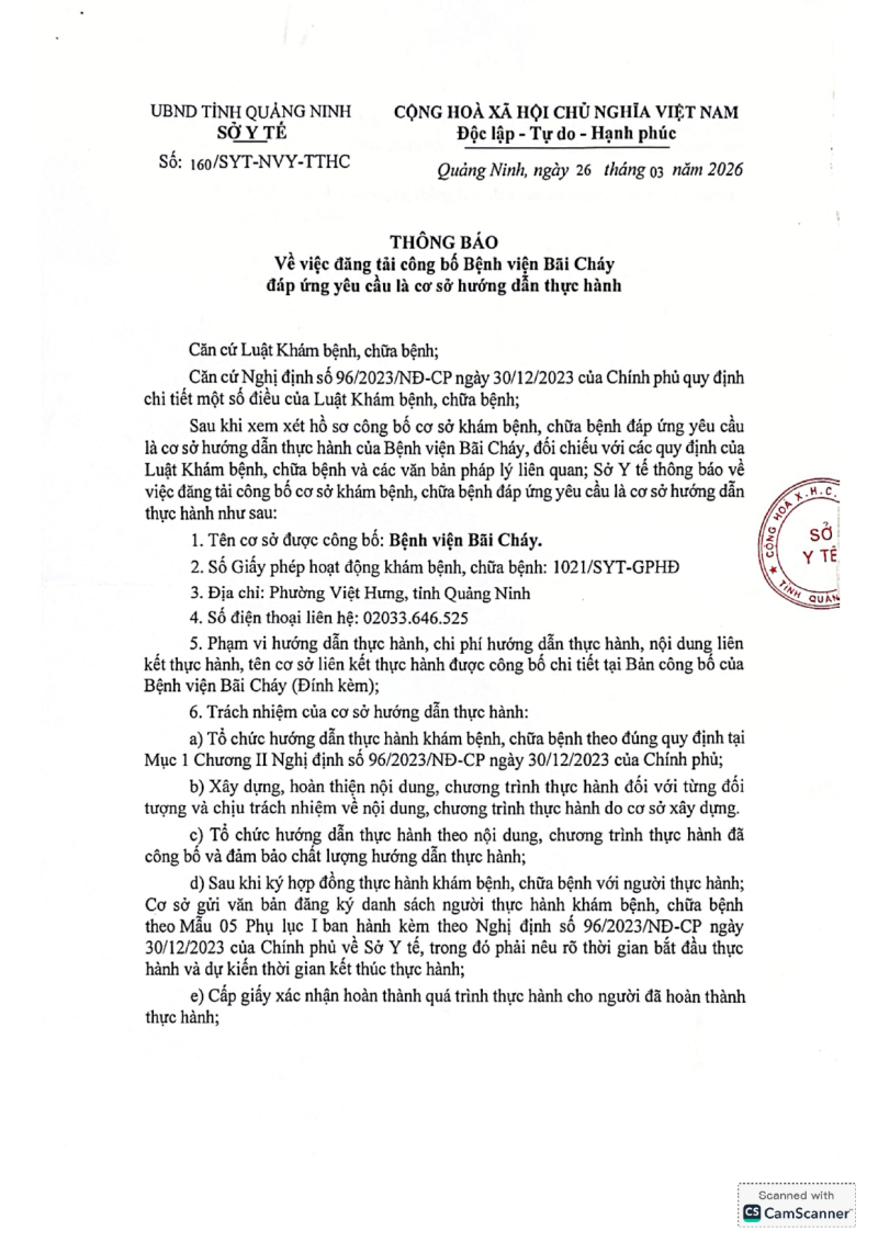Thông báo 160 về việc công bố Bệnh viện Bãi Cháy đáp ứng yêu cầu cơ sở hướng dẫn thực hành