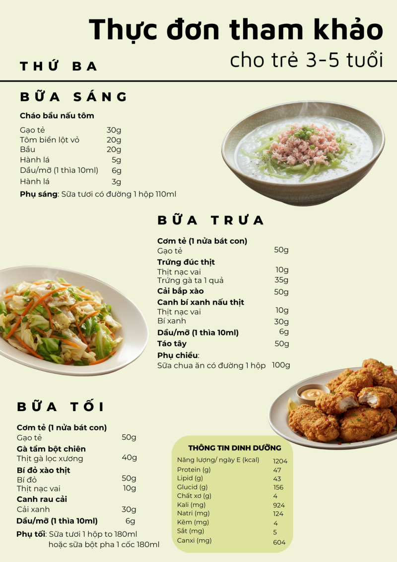 Giai đoạn 3–5 tuổi là thời kỳ trẻ phát triển nhanh cả về thể chất lẫn trí tuệ, nhu cầu năng lượng và dinh dưỡng tăng cao. Một thực đơn hợp lý, cân đối giữa các nhóm thực phẩm sẽ giúp trẻ ăn ngon, tăng trưởng tốt và phòng tránh thiếu vi chất. Bài viết giới thiệu thực đơn mẫu cho trẻ 3–5 tuổi được xây dựng dựa trên khuyến nghị của Viện Dinh dưỡng, đảm bảo đủ năng lượng, cân đối giữa các nhóm thực phẩm và phù hợp với khẩu phần khuyến nghị hằng ngày cho lứa tuổi mầm non.