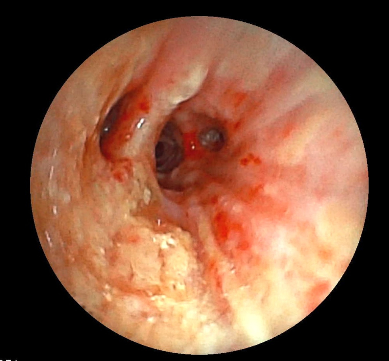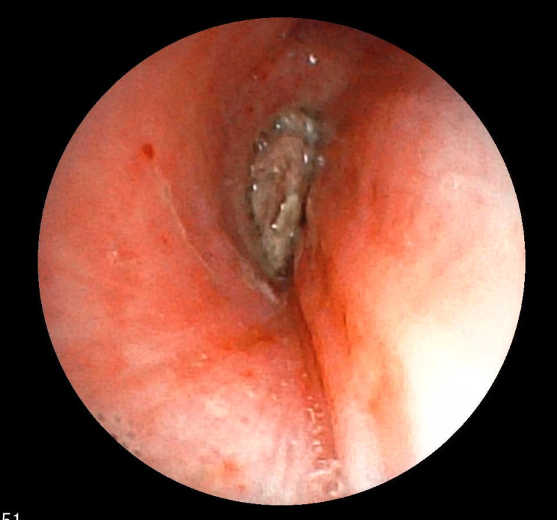 Bệnh nhân Ngô T H (57 tuổi, ở TP Hà Nội) nhập viện trong tình trạng tức ngực, khó thở sau khi nuốt hạt kha tử có kích thước khoảng 1cm. Kết quả chụp CTscanners ngực cho hình ảnh dị vật nằm trong lòng phế quản gốc phải sát chỗ chia nhánh phân thùy kích thước khoảng 10x8mm. Người bệnh được chỉ định can thiệp nội soi phế quản gắp dị vật đường thở.