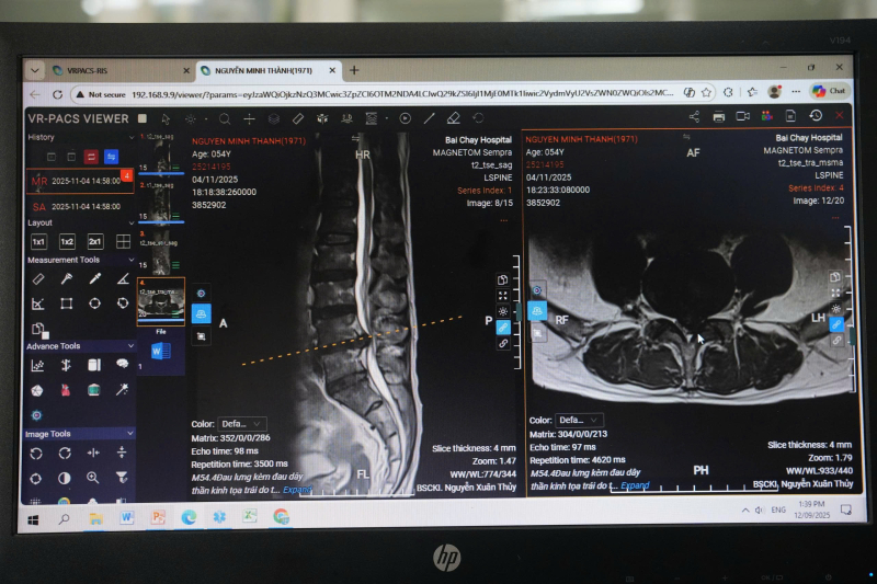 Ngay khi tiếp nhận bệnh nhân tại Khoa Thần kinh lồng ngực, BSCKII Lê Triệu Linh – Phó Trưởng khoa đã trực tiếp thăm khám lâm sàng, đánh giá phản xạ, sức cơ và chỉ định chụp cộng hưởng từ MRI. Kết quả cho thấy bệnh nhân bị thoát vị đĩa đệm cột sống thắt lưng L4,5 mức độ nặng, khối thoát vị lớn chèn ép rễ thần kinh, gây đau lan và yếu chân trái rõ rệt, cần can thiệp phẫu thuật.
