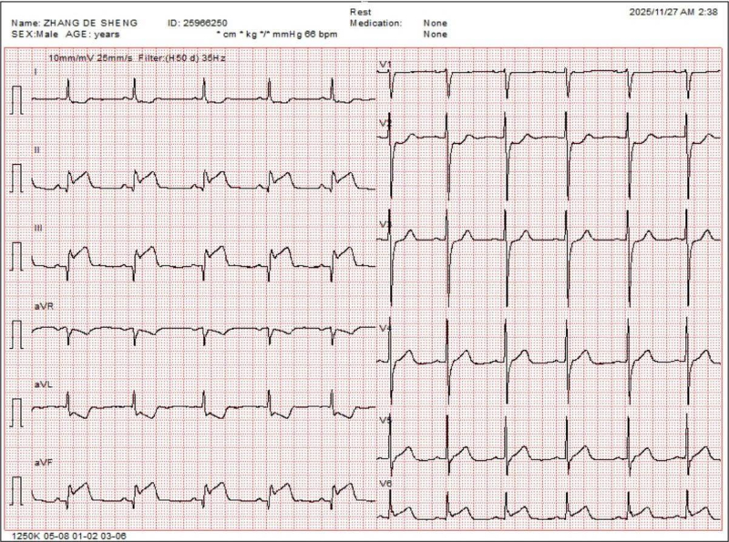 Tại khoa cấp cứu: người bệnh đã nhanh chóng được làm điện tim đồ và các xét nghiệm máu cần thiết. Trên điện tim ghi nhân có hình ảnh ST chênh lên ở các chuyển đạo thành dưới tim tối cấp. Tình trạng người bệnh có thời điểm nhịp tim chậm xuống 39 - 41 chu kỳ/ phút. Ngay lập tức, bệnh viện đã kích hoạt “báo động đỏ” nội viện và chuyển thẳng người bệnh vào phòng can thiệp.