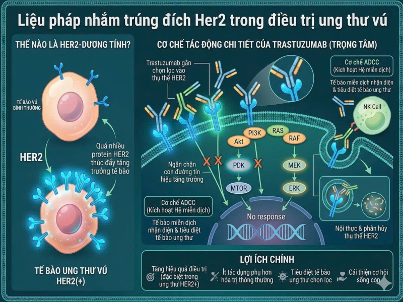 Trong những năm gần đây, sự ra đời của liệu pháp nhắm trúng đích HER2 đã tạo ra bước tiến quan trọng trong điều trị ung thư vú. Các thuốc nhắm trúng đích như trastuzumab và một số thuốc kháng HER2 thế hệ mới có khả năng gắn đặc hiệu vào thụ thể HER2 trên tế bào ung thư, từ đó ức chế các tín hiệu thúc đẩy sự tăng sinh và phát triển của khối u, đồng thời nâng cao hiệu quả điều trị khi phối hợp với các phương pháp điều trị khác.