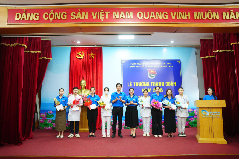 Tham dự buổi lễ có đồng chí Đỗ Ánh Quyên – Chủ tịch Hội Liên hiệp Thanh niên – Phó bí thư Đoàn phường Việt Hưng; BSCKII Hoàng Văn Quyết – Phó Bí thư Đảng ủy – Phó Giám đốc Bệnh viện Bãi Cháy; đồng chí Cao Đức Mạnh – Bí thư Đoàn thanh niên Bệnh viện, 68 đồng chí đoàn viên được Trưởng thành đoàn năm 2026 và đông đảo đoàn viên thanh niên đến từ 10 chi đoàn trực thuộc.