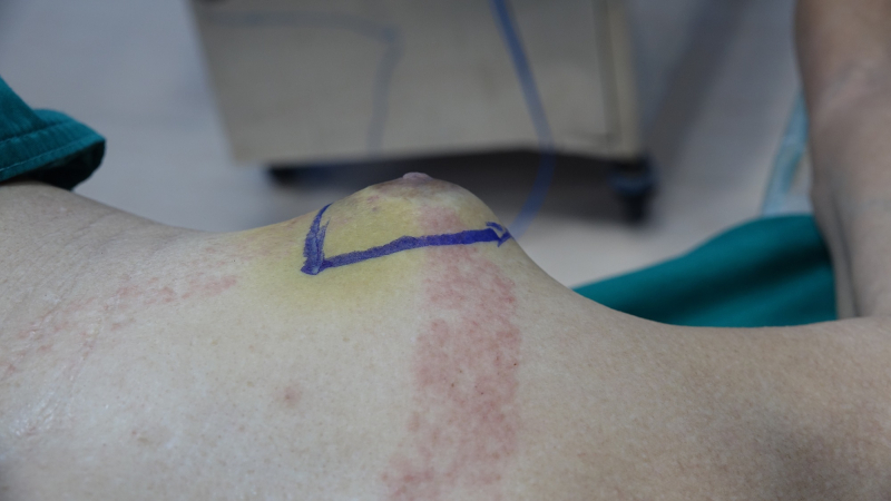 Bệnh nhân Phạm V D (86 tuổi, ở xã Thái Ninh, tỉnh Hưng Yên) có tiền sử tăng huyết áp, khám tại Bệnh viện Bãi Cháy với khối u vùng vú phải phát triển to nhanh, gây đau nhiều ảnh hưởng đến sinh hoạt. Kết quả siêu âm, chụp CTscanner lồng ngực cho thấy phần mềm vùng vú phải có khối u kích thước 47x33x36mm, hạch nhỏ nách hai bên. Kết quả sinh thiết xác định ung thư biểu mô tuyến vú phải giai đoạn cT2N0M0. Các bác sĩ đã hội chẩn chuyên khoa ung bướu quyết định hướng điều trị phẫu thuật cắt tuyến vú phải kèm vét hạch nách nhằm loại bỏ triệt để tổn thương và nguy cơ di căn.