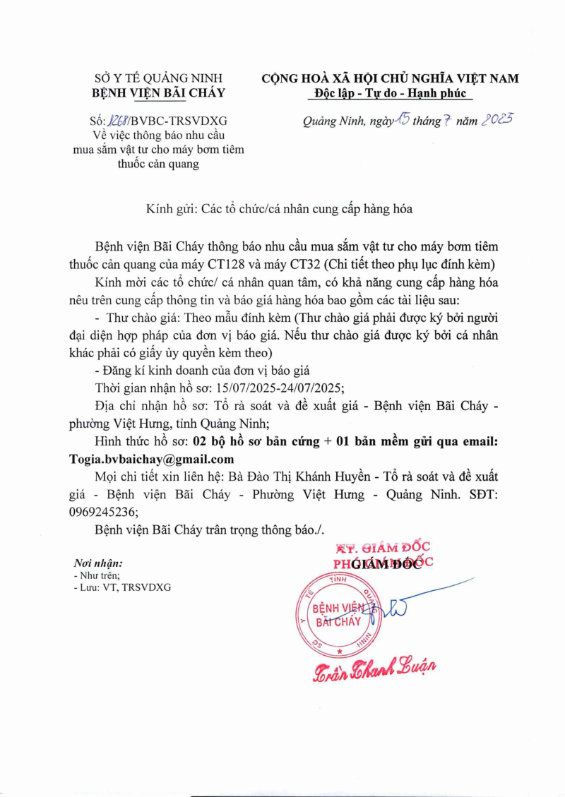 Thông báo 1268 nhu cầu mua sắm vật tư cho máy bơm tiêm thuốc cản quang 2025/07/15 09:52 Thông báo 1268 nhu cầu mua sắm vật tư cho máy bơm tiêm thuốc cản quang