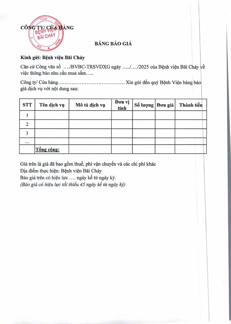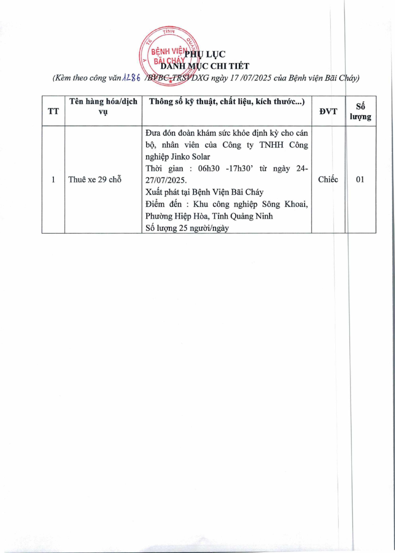 Thông báo 1286 nhu cầu thuê xe đưa đón đoàn khám sức khỏe định kỳ 2025/07/17 09:00 Thông báo 1286 nhu cầu thuê xe đưa đón đoàn khám sức khỏe định kỳ
