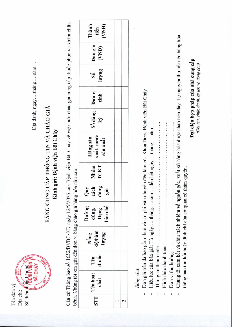 Thông báo 1652 mời chào giá cung cấp phục vụ khám chữa bệnh 2025/09/12 08:25 Thông báo 1652 mời chào giá cung cấp phục vụ khám chữa bệnh