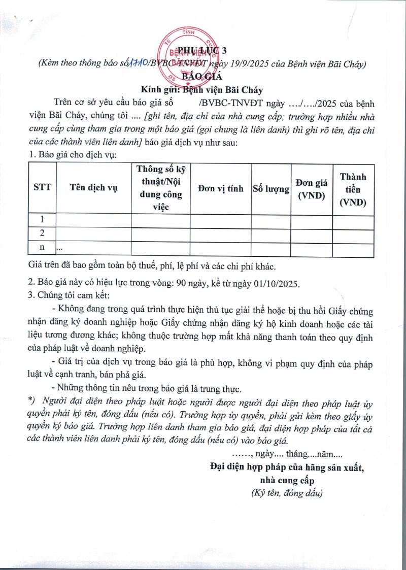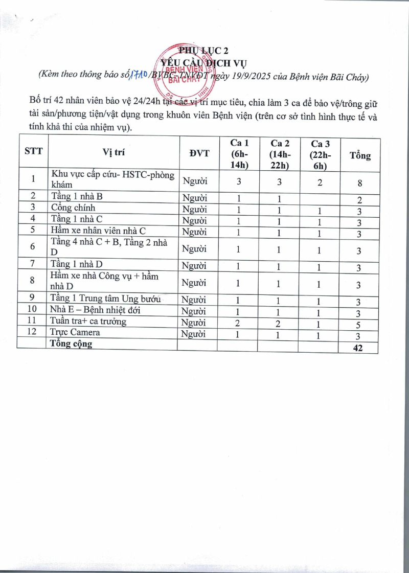 Thông báo 1710 nhu cầu cung cấp dịch vụ bảo vệ năm 2026 tại Bệnh viện Bãi Cháy 2025/09/22 08:13 Thông báo 1710 nhu cầu cung cấp dịch vụ bảo vệ năm 2026 tại Bệnh viện Bãi Cháy