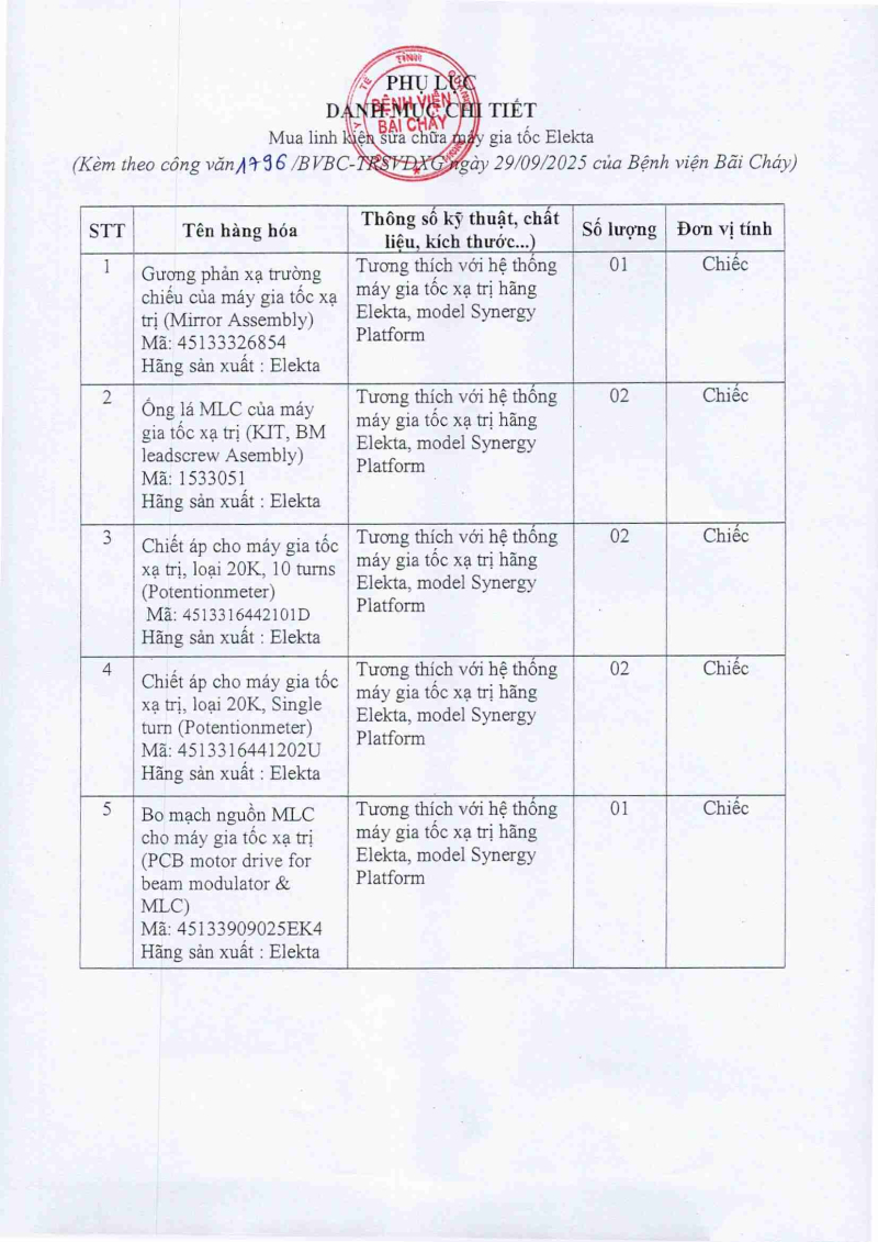 Thông báo 1796 nhu cầu mua linh kiện sửa chữa máy gia tốc Elekta 2025/09/29 07:35 Thông báo 1796 nhu cầu mua linh kiện sửa chữa máy gia tốc Elekta