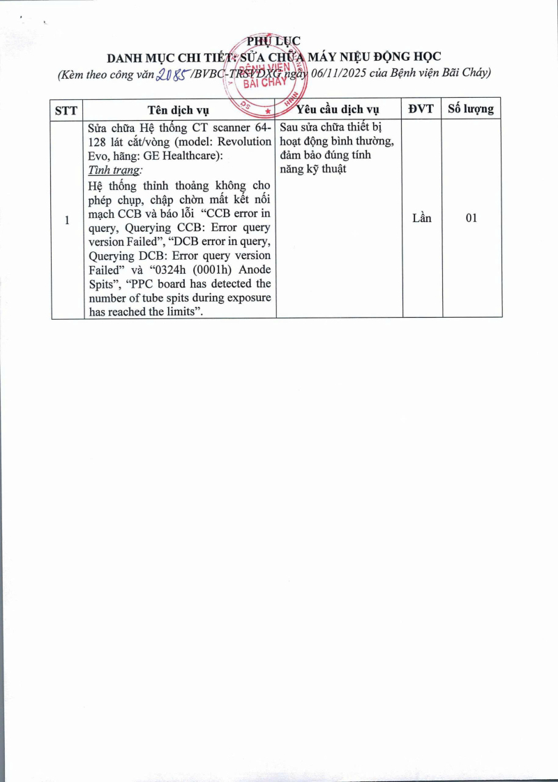 Thông báo 2085 nhu cầu sửa chữa hệ thống CT scanner 2025/11/06 08:31 Thông báo 2085 nhu cầu sửa chữa hệ thống CT scanner