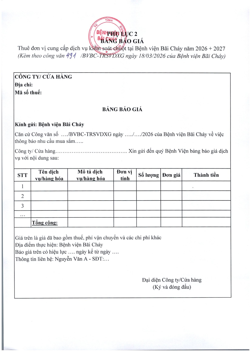 Thông báo 491 nhu cầu thuê đơn vị cung cấp dịch vụ kiểm soát chuột tại Bệnh viện Bãi Cháy
