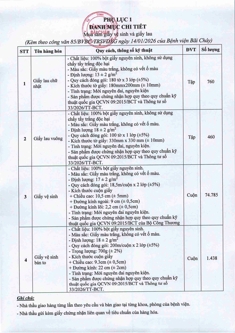 Thông báo 85 về việc thông báo nhu cầu mua sắm giấy vệ sinh và giấy lau 2026/01/16 00:43 Thông báo 85 về việc thông báo nhu cầu mua sắm giấy vệ sinh và giấy lau