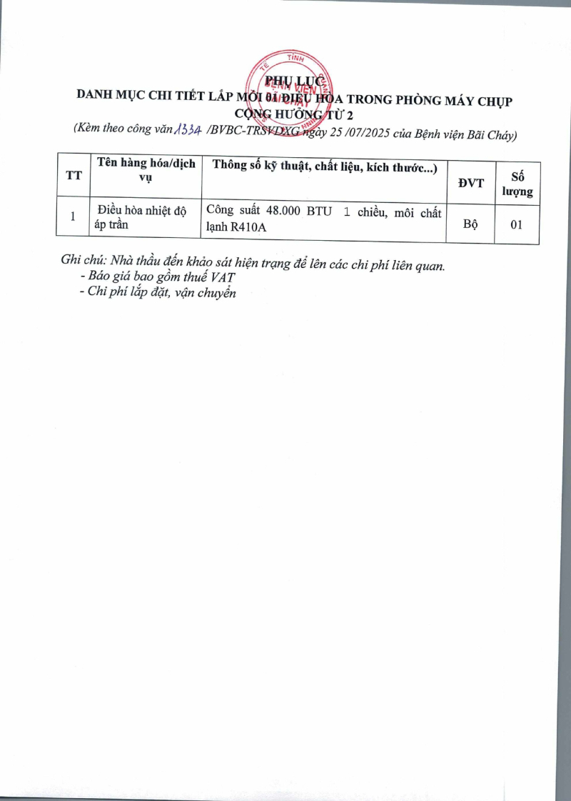 Thông báo 1334 nhu cầu lắp mới 01 điều hòa trong phòng máy chụp CHT 2 2025/07/25 08:53 File đính kèm: Thông báo 1334