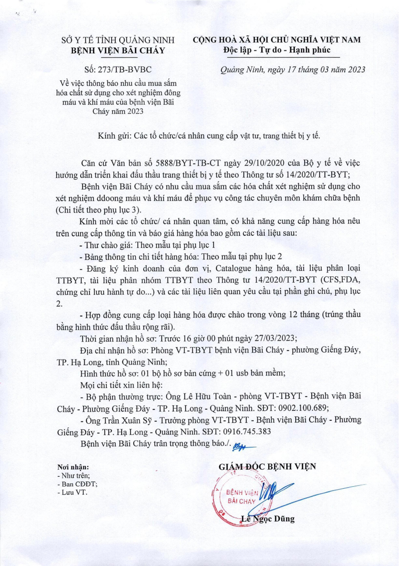 Bệnh viện Bãi Cháy ban hành công văn số 273/TB-BVBC ngày 17/3/2023 thông báo nhu cầu mua sắm hóa chất sử dụng cho xét nghiệm đông máu và khí máu năm 2023.