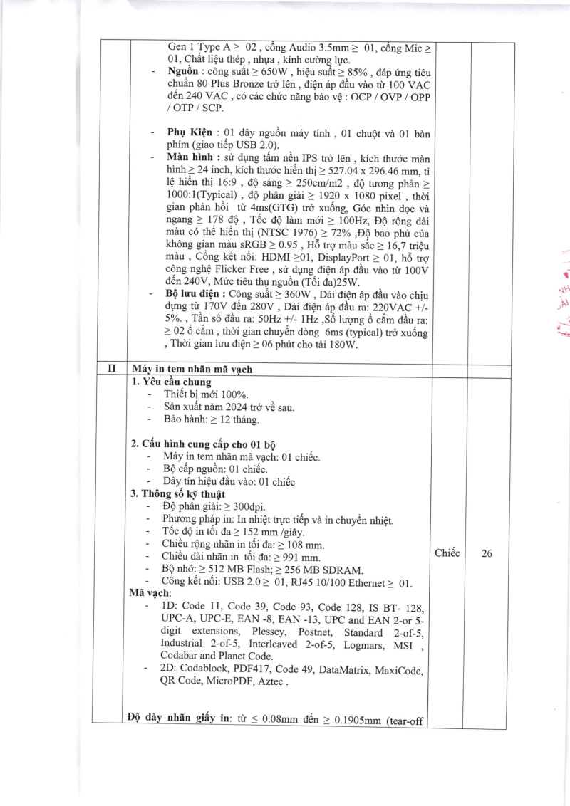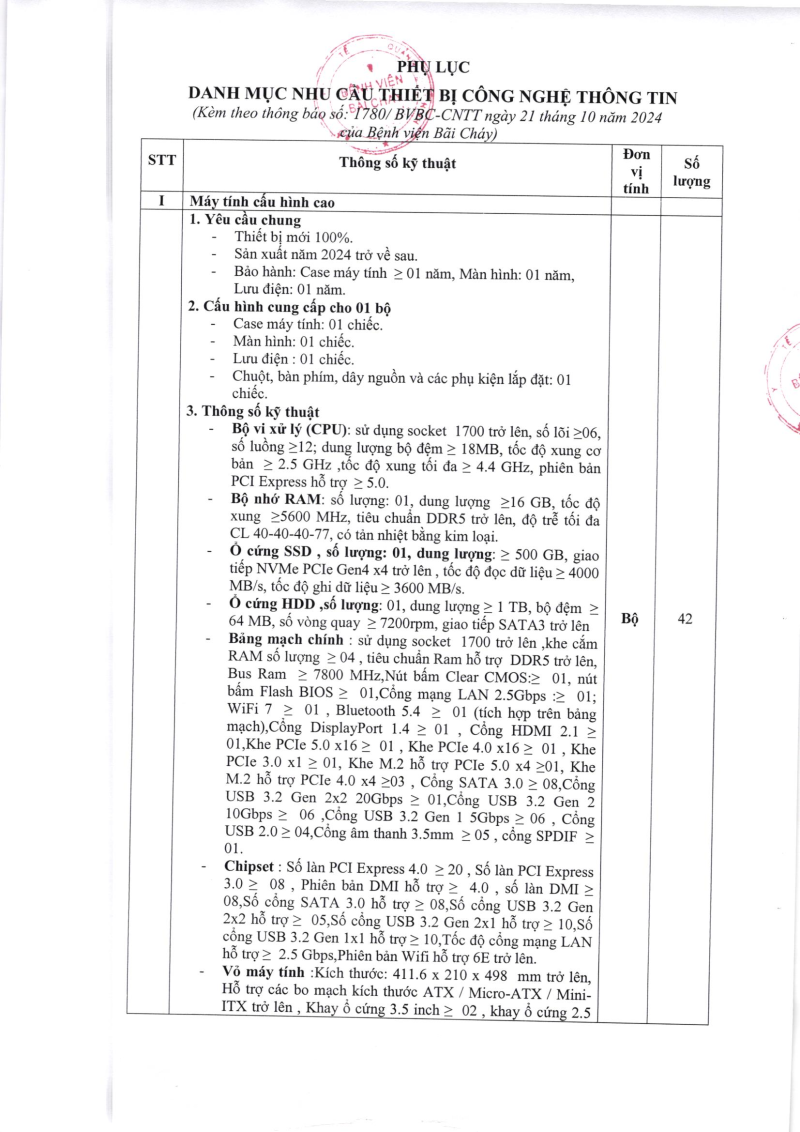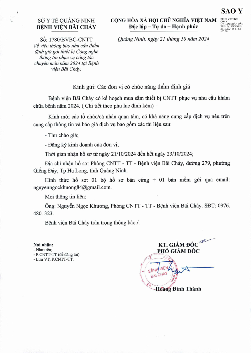 Thông báo nhu cầu thẩm định giá gói thiết bị Công nghệ thông tin phục vụ công tác chuyên môn năm 2024 tại Bệnh viện Bãi Cháy 2024/10/21 09:29