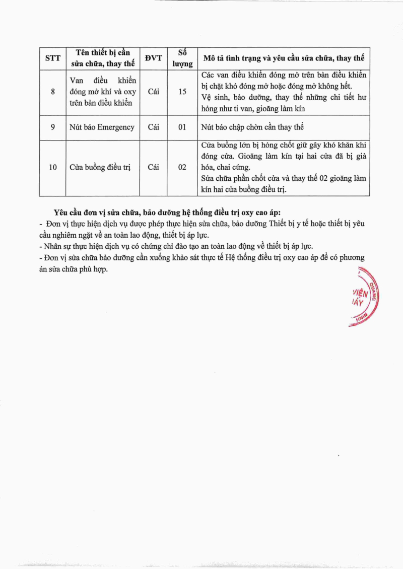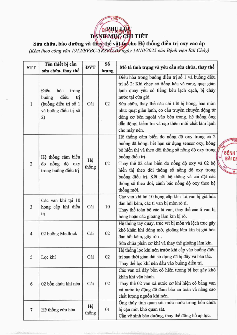 Thông báo số 1912 về nhu cầu sửa chữa, bảo dưỡng và thay thế hệ thống điều trị ô xy cao áp 2025/10/14 08:59