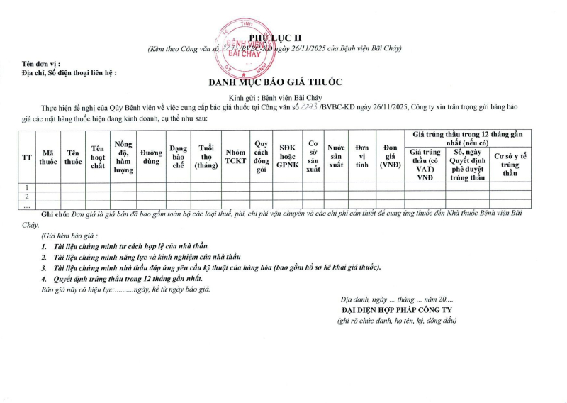 Thông báo số 2273 mời báo giá thuốc cho nhà thuốc bệnh viện năm 2026 lần 1