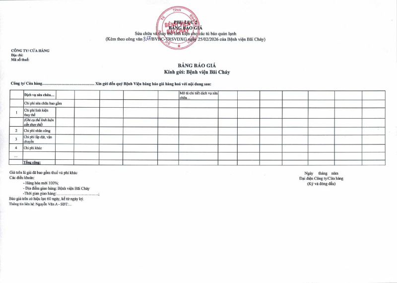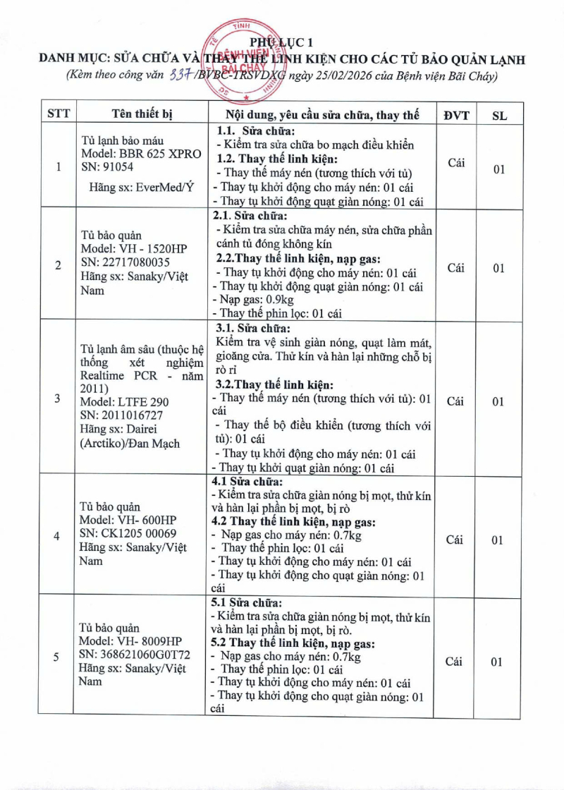 Thông báo số 337 về nhu cầu sửa chữa và thay thế linh kiện cho các tủ bảo quản lạnh