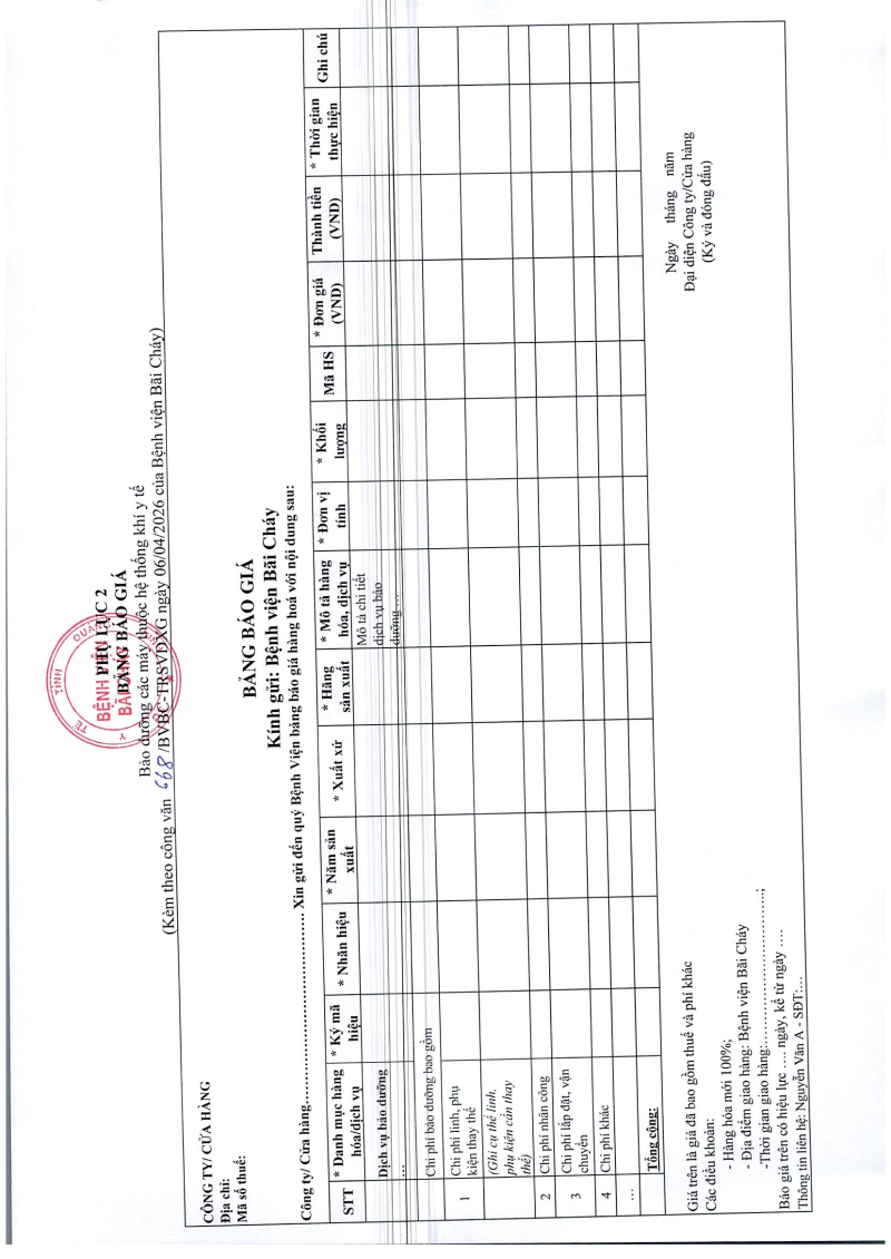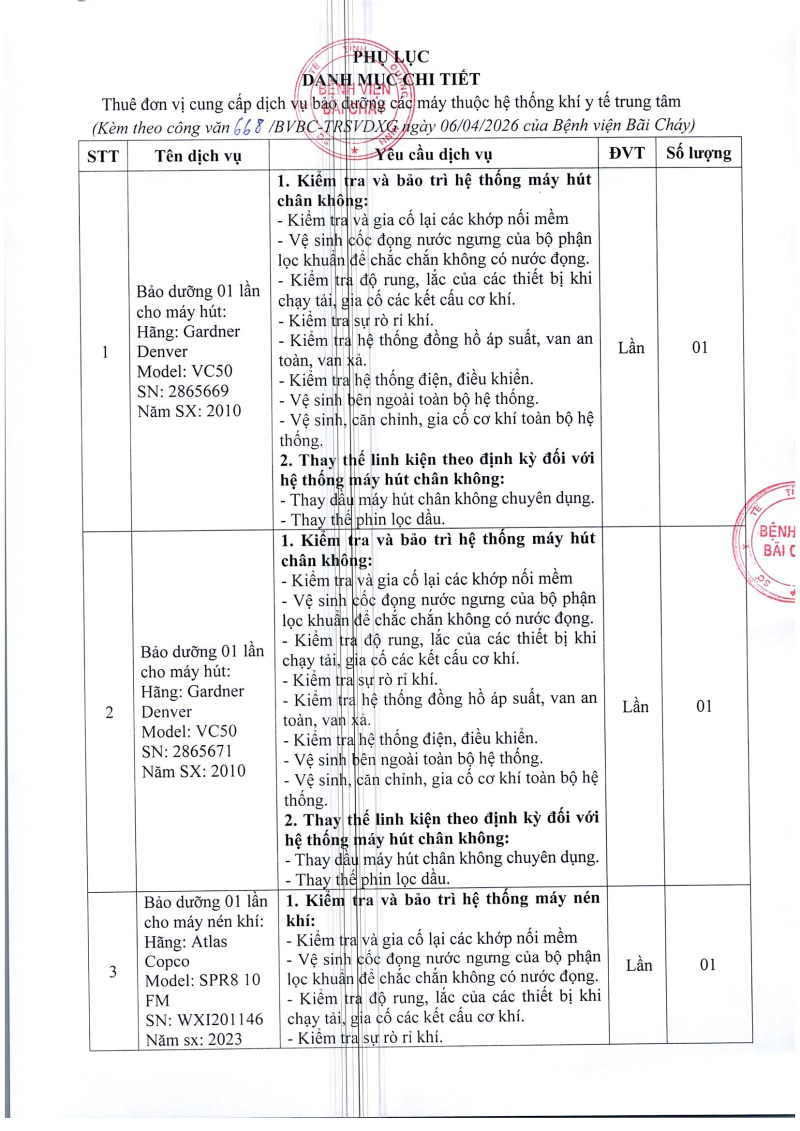 Thông báo số 668 về nhu cầu thuê đơn vị cung cấp dịch vụ bảo dưỡng các máy thuộc hệ thống khí y tế trung tâm 2026/04/07 02:04