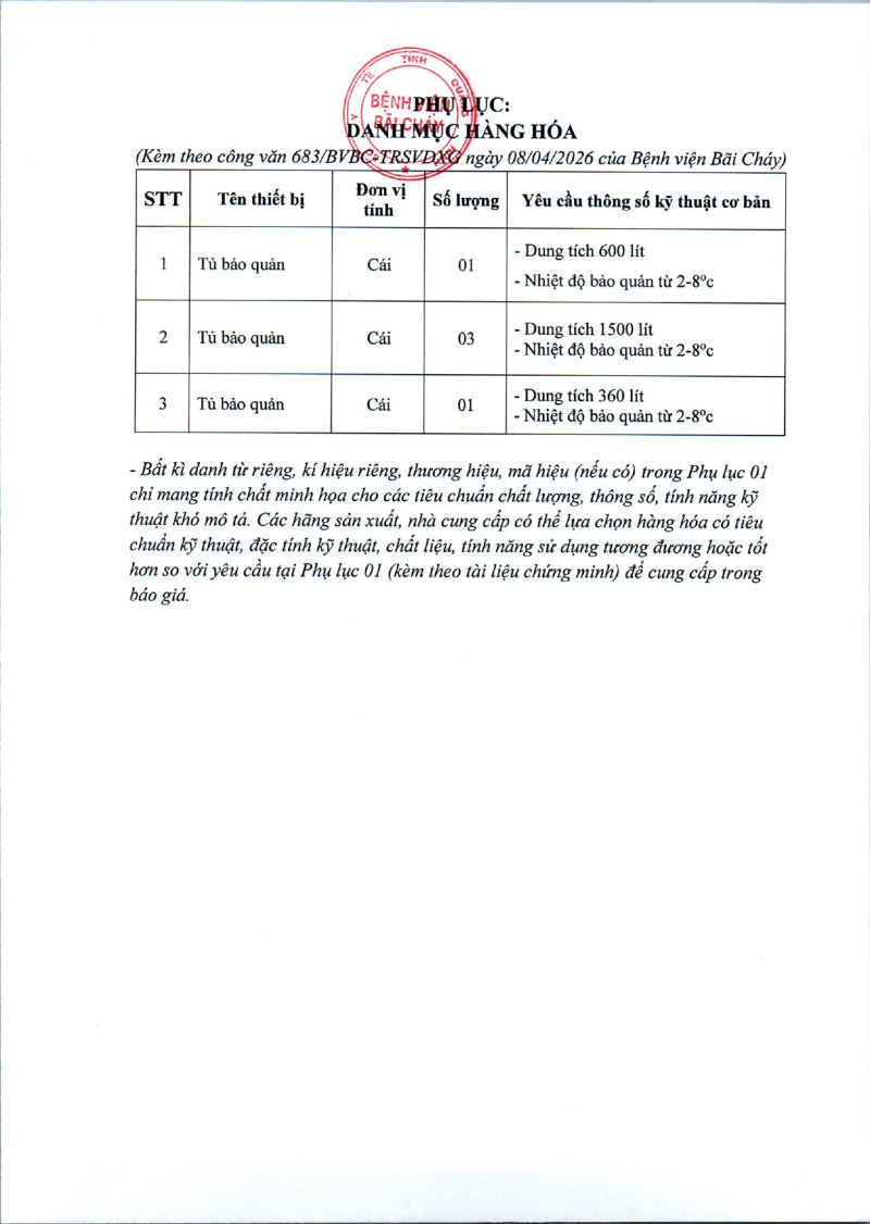 Thông báo số 683 về nhu cầu mua tủ bảo quản thuốc và vacxin phục vụ công tác tiêm vacxin dịch vụ tại bệnh viện Bãi Cháy 2026/04/08 08:04