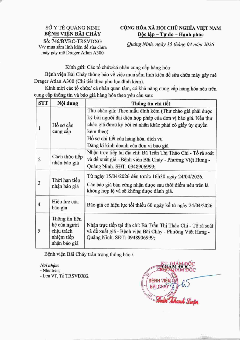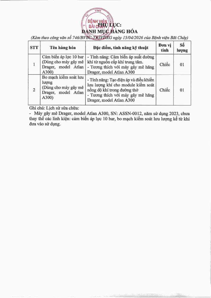 Thông báo số 746 về nhu cầu mua sắm linh kiện để sửa chữa máy gây mê Drager Atlan A300